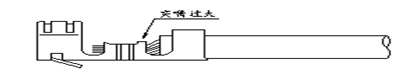 (6)导体压着过短(即导体未完全被压着或没被端子内模包覆),此种现象将造成端子拉力不足,易脱落,如图: